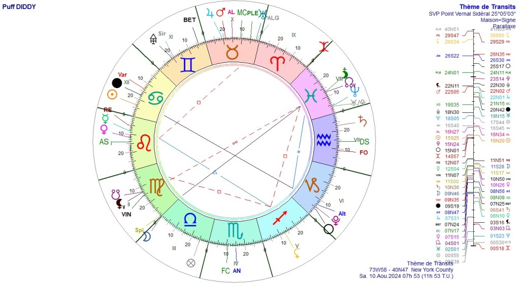 Voici à présent le thème de l’entrée dans la période Rahu/Kéthu/Saturne qui est celle que traverse DIDDY depuis le 10 août 2024, et durant laquelle il fut arrêté.