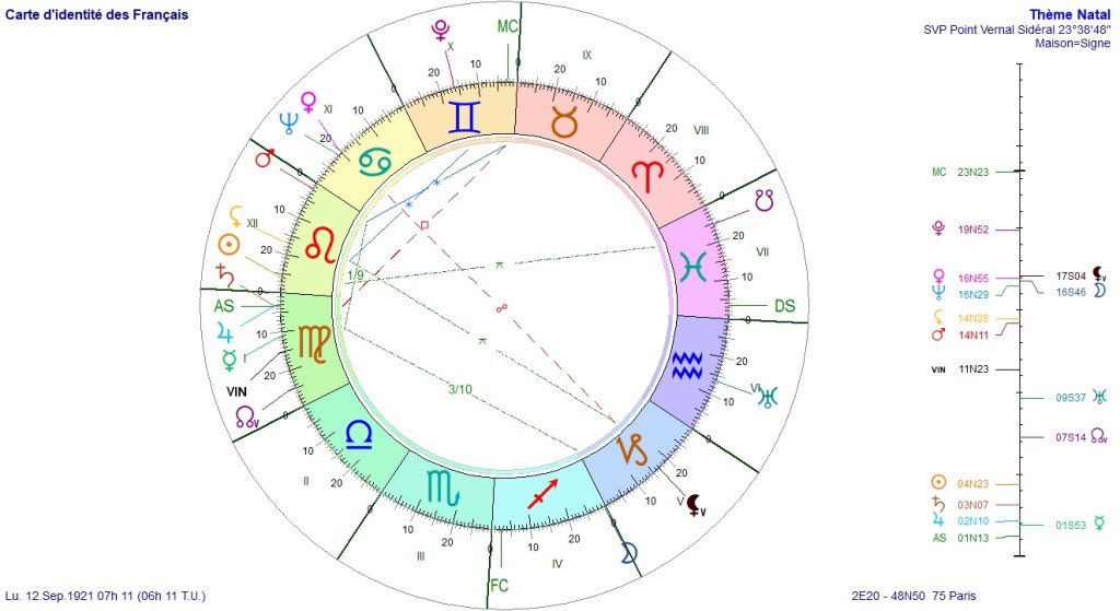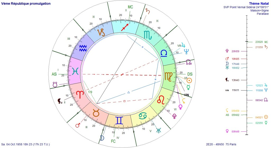 Au final, il y a beaucoup de violences sous-jacentes dans ce gouvernement. Le dc 9 renseigne sur l’issue des promesses du thème de naissance. Nous voyons bien que ce gouvernement finira dans une grande violence. Violence sociale (Uranus en VII), violence populaire (Mars en IV). Saturne en X est maitre de VIII (la mort). En un mot, cela risque de mal finir.