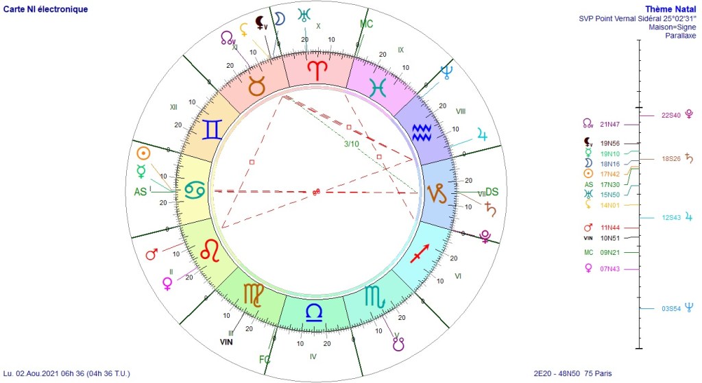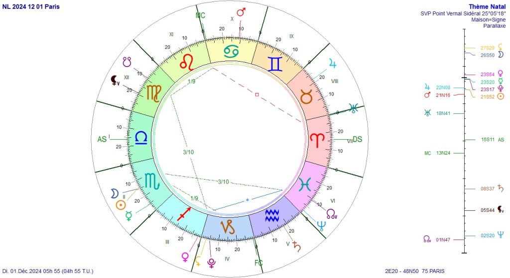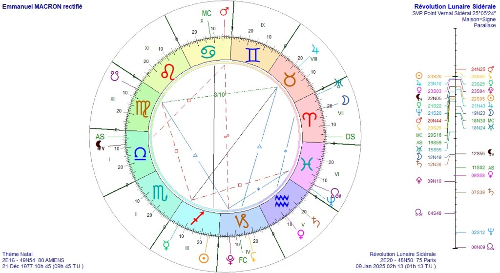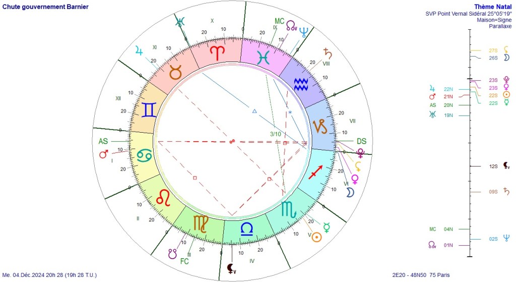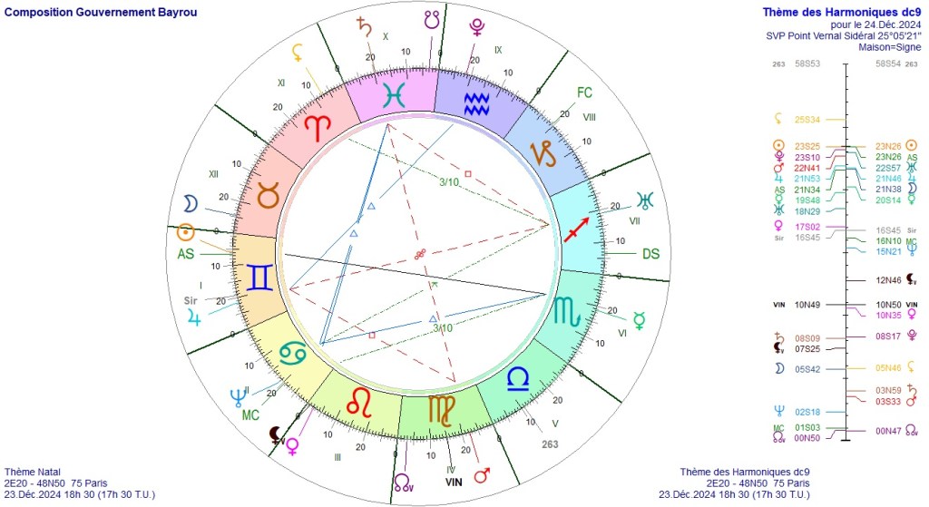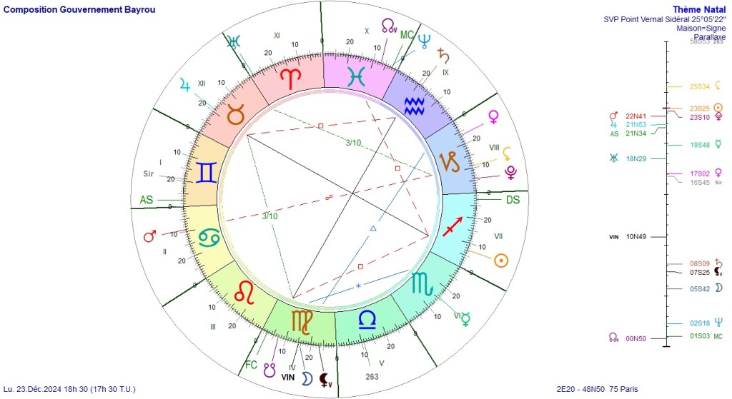 Un mot sur le lien entre ce gouvernement et le thème du président de la République dont ce fut le 47ème anniversaire deux jours plus tôt. L’on remarquera les similitudes : Mars en chute dans les deux thèmes, même opposition Mercure/Jupiter, opposition des deux Saturne et des deux Uranus. Pluton est sur l’ascendant du président ; ce gouvernement est davantage celui du président que celui de BAYROU. Mars transite la cuspide de sa maison VII. La chute de ce gouvernement annoncera-t-elle aussi sa propre chute ?