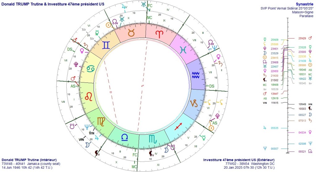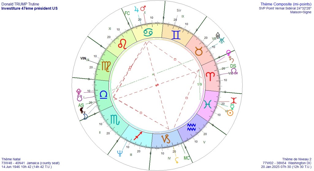 En continuant l’analyse, nous voyons une conjonction Saturne/Vénus en maison II. Considérée seule, cette conjonction conforte ce qui a été dit plus haut, à savoir de gros soucis pour les grosses fortunes, notamment dans le spectacle. Mais il est intéressant de voir que TRUMP a aussi une conjonction Saturne/Vénus dans son thème de naissance, néanmoins peu valorisé. Toutefois Saturne se situe à 29 gémeaux soit exactement sur le Mars du thème d’investiture qui sera hors limite en déclinaison (25N29), qui plus est, au carré de la Lune Noire. TRUMP est très marqué par Mars qui est sur son ascendant natal. Ce n’est pas de bon augure pour lui. Mars est dominant dans ce thème d’investiture, comme l’est aussi Pluton. Ce sont les deux planètes maitresses du Scorpion, là où TRUMP à une conjonction Lune/Kéthu. Sa Lune est donc en chute dans son thème de naissance. L’on peut donc s’interroger sur la durée de vie de TRUMP au cours de ce mandat, d’autant que le Milieu du Ciel du thème d’investiture est conjoint au Fond du Ciel du thème de TRUMP, comme vous pouvez le voir ci dessous