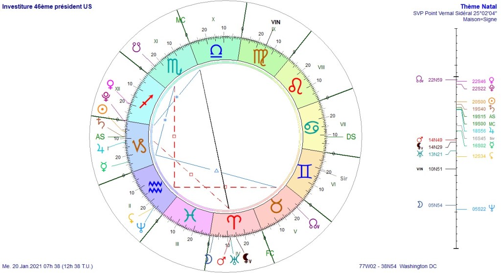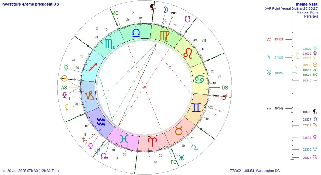 Difficile de faire plus mauvais. La Lune Noire est sur l’ascendant, Mars est en chute, Saturne est en chute, Mercure est en chute. Seul Jupiter est favorable car en exaltation dans le signe du Cancer. Dites-moi ce que vous pensez de ce thème ? Ne le trouvez-vous pas profondément destructeur ? Que restera-t-il de l’Amérique à la fin de ce mandat ?