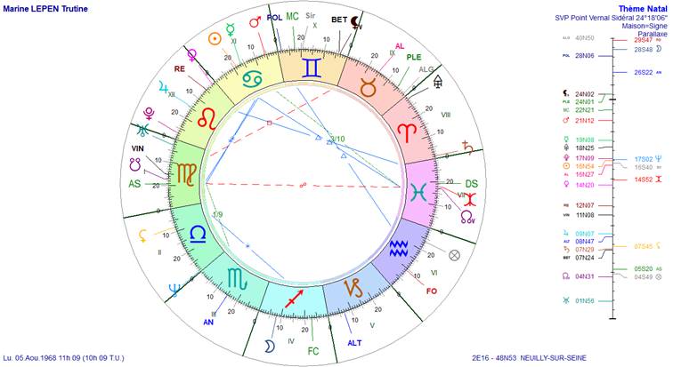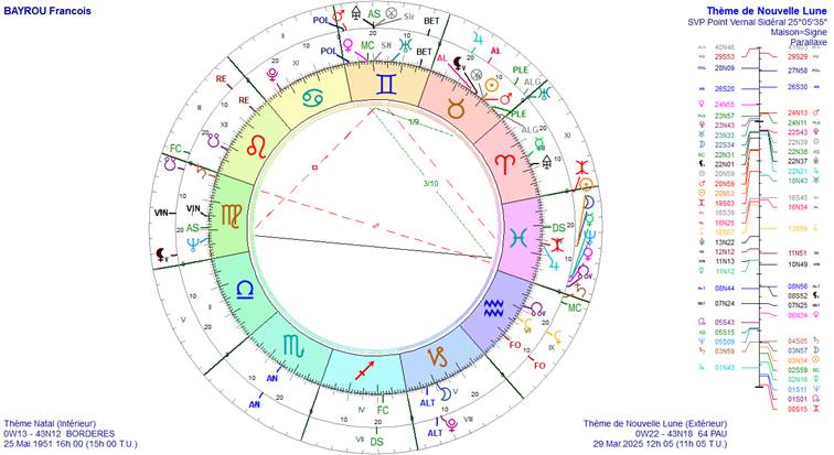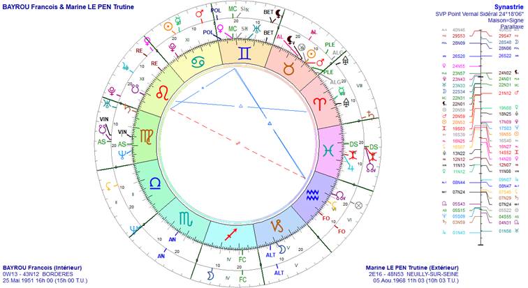 Il n’y a pas que Marine LE PEN qui est concernée par cette éclipse, mais également le Premier Ministre actuel, François BAYROU. En effet, celui-ci a son ascendant à 1° seulement de celui de MLP et son Milieu du Ciel exactement sur le Milieu du Ciel de Marine LE PEN.