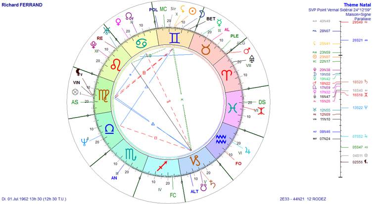 Jamais deux sans trois, dit-on. Effectivement, un troisième personnage sera dans l’œil du cyclone. Il s’agit de Richard FERRAND, nouveau président du Conseil Constitutionnel. Richard FERRAND a, lui aussi, l’ascendant en Vierge, et donc Eris au descendant, cette planète évoluant très lentement. Voici son thème de naissance.
