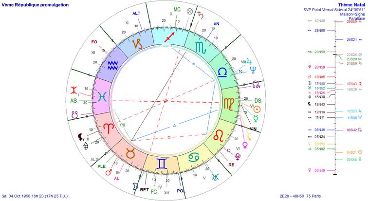Comme vous le voyez, l’ascendant de la Vème République est dans la constellation des Poissons que l’éclipse va transiter. Les autres pays européens qui nous entourent ne seront pas touchés de la même manière, ni avec autant d’intensité, car ils ne sont pas marqués par le signe des Poissons comme l’est la France.