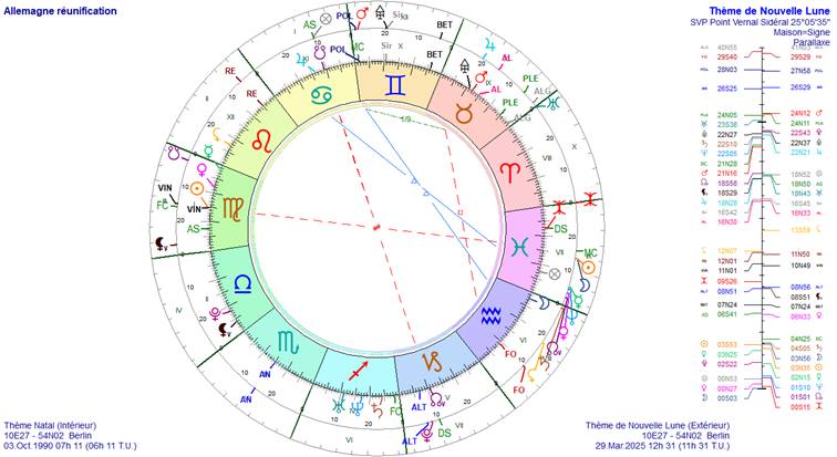 L’opposition Soleil/Soleil se double d’une ligne d’horizon du thème de la Nouvelle Lune superposée exactement sur l’axe des Nœuds Lunaires du thème de la réunification. Cela signifie une sorte de retour karmique. L’Allemagne n’a toujours pas digéré sa réunification, et cela doit se manifester après les élections. En résumé, cette prochaine éclipse du Soleil dans la constellation des Poissons annonce des évènements très riches en bouleversements, en révélations, dans la plus grande confusion. Transitant la planète Eris dans plusieurs thèmes, elle signifie un rééquilibrage. C’est le côté positif d’Eris. Si cette planète signifie souvent « chaos », c’est toujours pour chercher à retrouver un équilibre perdu, retrouver ses valeurs. Un Ordo ab chaos, mais dans le bon sens du terme.