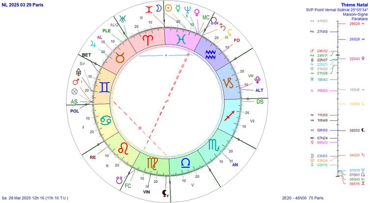 En dernière minute, je ne peux résister à l’envie de vous montrer la sysnastrie entre le thème de JM TROGNEUX et celui de l’éclipse solaire du 29 mars 2025.