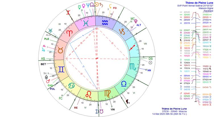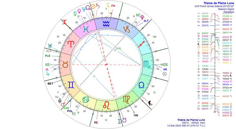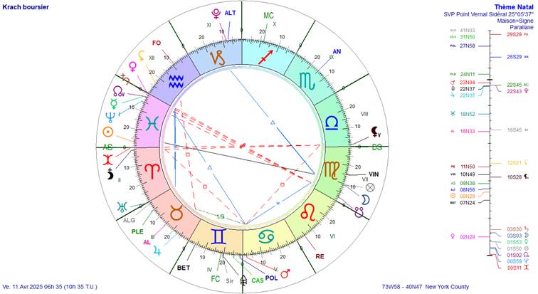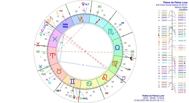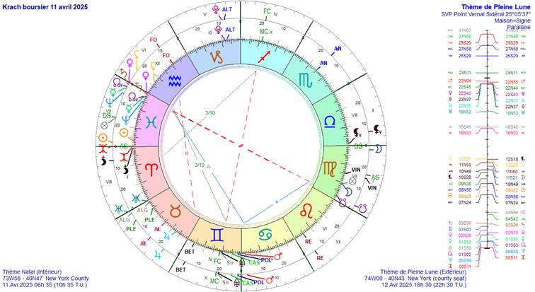 Nous avons donc beaucoup de paramètres qui laissent entendre que quelque chose de l’ordre d’une profonde désorganisation peut se produire le 11 avril 2025. Je mettrais le curseur à 60%, ce qui est déjà beaucoup. J’aurais mis plus si Mars, bien qu’au plus haut en déclinaison, avait été sur un angle ou conjoint à un nœud lunaire.
