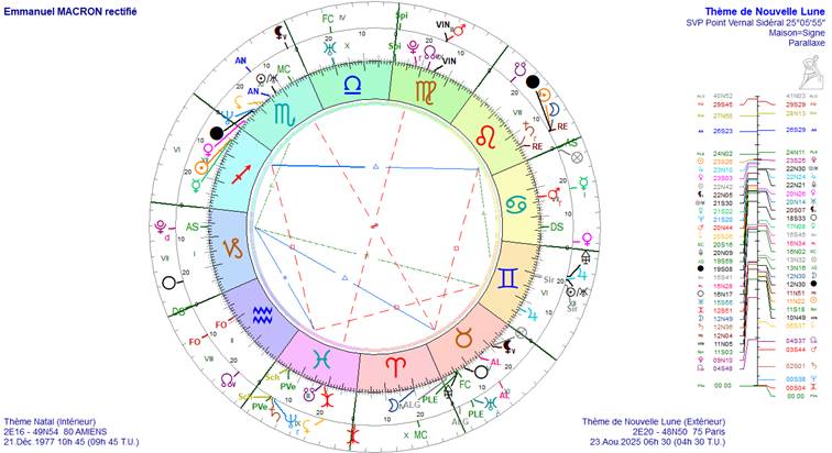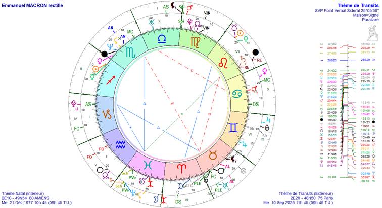 Regardons maintenant le thème de transit du 10 septembre 2025 sur le thème natal de MACRON