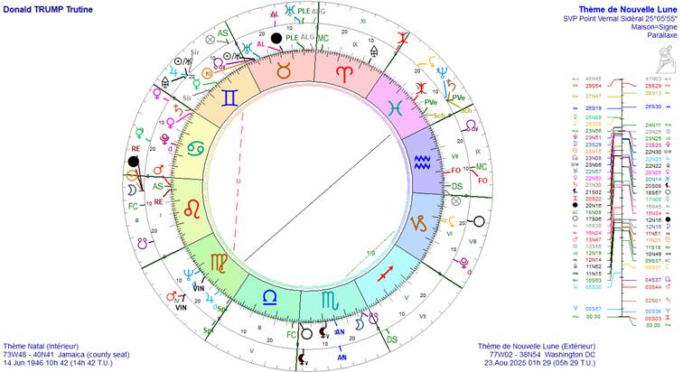 Dans le thème de TRUMP, la Nouvelle Lune transite Mars sur Régulus et l’ascendant. Cela met particulièrement en lumière les actions (Mars) que TRUMP voudra engager. Cela met également en valeur la personnalité de TRUMP puisque la Lune est sur son ascendant. Disons qu’il a le vent en poupe, qu’il sera difficile de lui résister. Pour lui, c’est le moment d’agir. Toutefois, la Nouvelle Lune est dans un Nakshatra de Kéthu, le nœud lunaire sud, qui, dans son thème de naissance, est conjoint à la Lune. Ce ne serait pas une mauvaise chose si la Lune était positive. Cependant, la Lune est en Scorpion, son lieu de chute. De plus, n’oublions pas que TRUMP est né sous une éclipse de Lune. Elle est donc doublement défavorable : en chute et éclipsée. La Lune natale est en maison IV, celle de la fin de vie. Je ne peux que répéter ce que j’ai écrit de nombreuses fois, la santé de TRUMP n’est pas bonne ; il est beaucoup trop surmené à vouloir agir sur tous les terrains en même temps, à l’extérieur comme à l’intérieur des frontières. TRUMP est dans une période Jupiter/Kéthu. Kéthu, à la naissance, est dans un Nakshatra de Mercure en Gémeaux, donc dignifié. Mais il reçoit actuellement un carré de Mars en Vierge. Cela confirme la tension nerveuse dont je vous parlais. Je ne serais pas surpris qu’il fasse de l’hypertension. Compte tenu de son agenda très chargé, ce n’est pas le moment de faire au AVC.