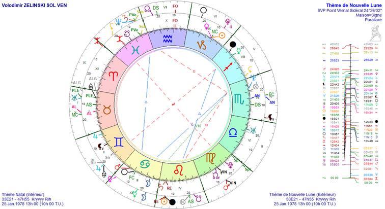 Si la nouvelle Lune active le Mars natal de TRUMP, elle active le Saturne natal de MACRON et de ZELINSKI qui, tous deux, ont Saturne sur Régulus. Mais la situation est fort différente pour les deux hommes. ZELINSKI a son Saturne natal en maison IV, alors que MACRON l’a en maison VIII. ZELINSKI est dans sa période Lune/Saturne depuis le 15 mai 2024. C’est la période à partir de laquelle les choses ont commencé à mal tourner pour lui. Il est devenu impopulaire dans son propre pays (typique des rapports Lune/Saturne). Son mandat présidentiel s’est achevé le 20 mai 2024, donc à l’entrée de sa nouvelle période. Depuis, tout s’est progressivement dégradé. L’armée ukrainienne perd régulièrement du terrain, les désertions se multiplient, la conscription obligatoire, de force, ne passe pas dans l’opinion. Cette Nouvelle Lune sur Saturne natal en maison IV signe la fin de son aventure. Le temps (Saturne) joue contre lui. Saturne lui dit de se replier, de courber l’échine. Nous trouvons le même rapport entre la Lune et Saturne dans sa révolution solaire 2025 où les deux planètes sont en carré et la Lune en chute. C’est une révolution solaire particulièrement difficile, puisque, outre la chute de la Lune, Mercure, maitre de l’ascendant annuel, entre en maison VIII, ce qui le met en danger personnellement, et que Neptune fait un carré exact à l’ascendant (il est dans la confusion la plus totale car Neptune est aussi conjoint à Rahu). Heureusement pour lui, ZELINSKI est né à l’heure de Vénus, ce qui le protège physiquement, mais pas politiquement.