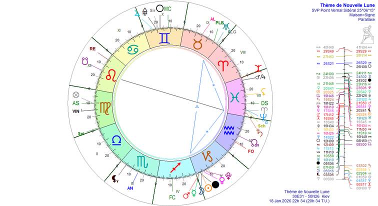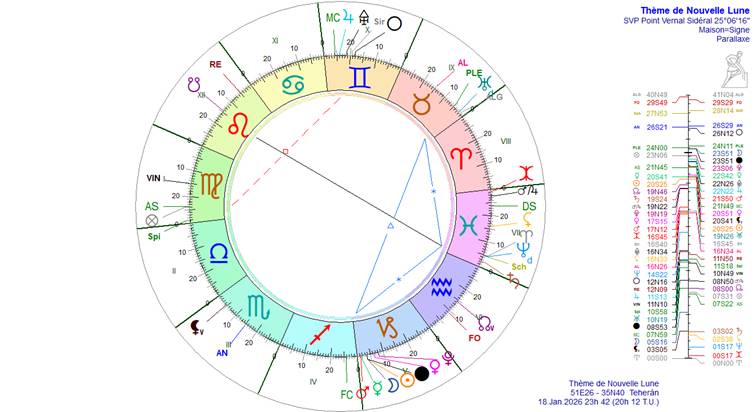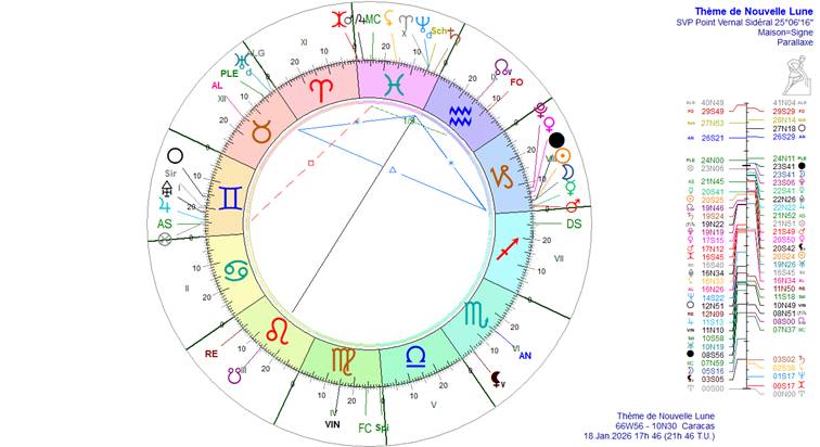 Retenons que la Nouvelle Lune sera dans le Nakshatra Uttara Ashadha avec un amas planétaire de nature très martienne dans la constellation du très stratégique Capricorne. Cela signifie un fort durcissement des relations internationales, des rapports de force sur le plan militaire, de reconfiguration des alliances, sur fond de pression collective croissante. Géopolitiquement, elle annonce une phase de « guerre froide chaude » : escalade dans les démonstrations de puissance, mesures coercitives, plutôt sous forme de pressions, sanctions, opérations ciblées et déploiements qu’en déclenchement immédiat d’un conflit total. Cela n’annonce pas une guerre mondiale, mais chacun montre ses muscles (Oreshnik russe en Ukraine, enlèvement de Maduro, tentative de révolution colorée en Iran en étaient les prémices). La liste n’est pas exhaustive. Il faut s’attendre à d’autres opérations analogues ailleurs qui donneront l’impression d’un chaos généralisé.
