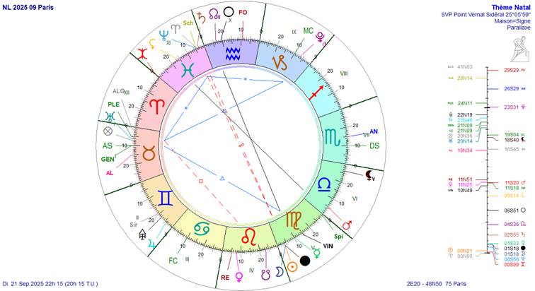 Deux évènements astrologiques se succèdent à un jour d’intervalle : la Nouvelle Lune le 21 septembre 2025 et l’équinoxe d’automne le 22 septembre 2025. Voici les deux thèmes, vus de Paris.