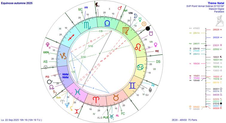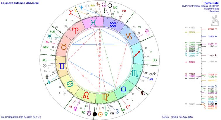Le Milieu du Ciel est entre Mars et Pluton, les deux maîtres du Scorpion. Le climat général sera donc autoritaire, vindicatif, violent, va-t-en guerre. Le carré de Mars à Pluton est significatif de brutalité, de cruauté. Cet aspect affectera la vie sociale, sociétale et géopolitique. Les partisans de la guerre nucléaire vont s’agiter comme jamais. La tension sera à son comble vers le 1er et le 2 octobre 2025 lorsque le Milieu du Ciel progressé sera sur le mi-point Mars/Pluton. Un acte de provocation est à craindre le 5 octobre 2025 lorsque la Lune Noire rencontrera Mars. Puis, entre le 5 et le 8 octobre 2025, la Lune Noire sera entre Mercure (planète levante) et Mars, alors que l’axe des nœuds lunaires se superposera à l’axe de l’horizon progressé. L’on pense bien sûr au génocide des gazaouis, qui n’en finit pas, deux ans, presque jour pour jour, après l’attentat terroriste du 7 octobre 2023. L’on sait que certains dirigeants israéliens, parmi les plus fous, sont partisans d’une guerre nucléaire contre l’Iran. Qui les arrêtera ?