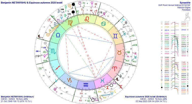 L’ascendant de NETANYAHU est exactement sur Antarès, comme le Milieu du Ciel de la France. Il y a forcément un lien entre le destin de la France et la personne de NETANYAHU qui, tous les deux sont encadrés par le carré Mars/Pluton. Cela ne sent pas bon. Ce dernier voudrait-il se venger de la reconnaissance de l’état de la Palestine par la France ?