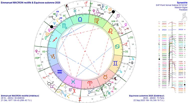 Voici un autre thème intéressant qui est celui de la comparaison entre le thème natal de MACRON et celui de l’équinoxe.