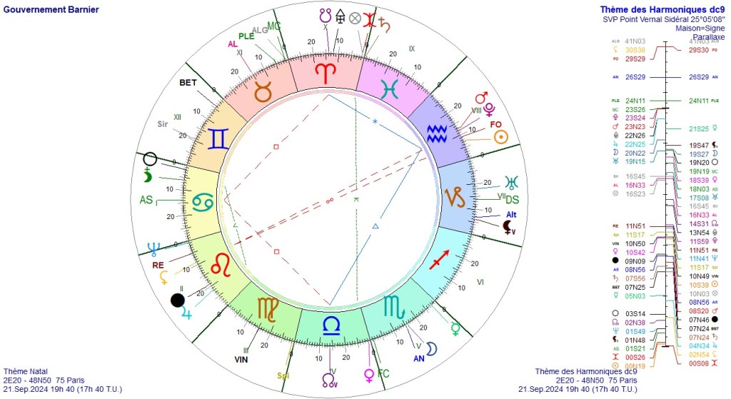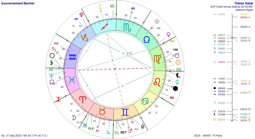 L’ascendant est donc dans un signe de Mars (Scorpion) et la Nouvelle Lune étant en Bélier est aussi en signe de Mars. Regardons la position de Mars. La planète est en chute dans le signe du Cancer, au carré de la Nouvelle Lune dans le signe du Bélier, donc le signe de Mars. L’on dit que les planètes sont en réception mutuelle. En France, l’on connait bien cette configuration puisqu’on la retrouve dans le ciel de naissance d’Emmanuel MACRON. Avec cette configuration, l’on veut se montrer le chef, et particulièrement le chef de guerre. C’est la figure que le chef de l’état montre aux Français depuis 2020. Et il continue puisque le lendemain de cette Nouvelle Lune, il fit une conférence de presse pour exalter la puissance de l’Europe qu’il voit aussi puissante que la Russie ou les Etats-Unis. Il a réaffirmé que la France pourrait mettre à disposition de l’Europe la force nucléaire de la France, alors que l’Europe n’existe pas en tant qu’état et n’a pas d’armée. Bref, fermons la parenthèse.